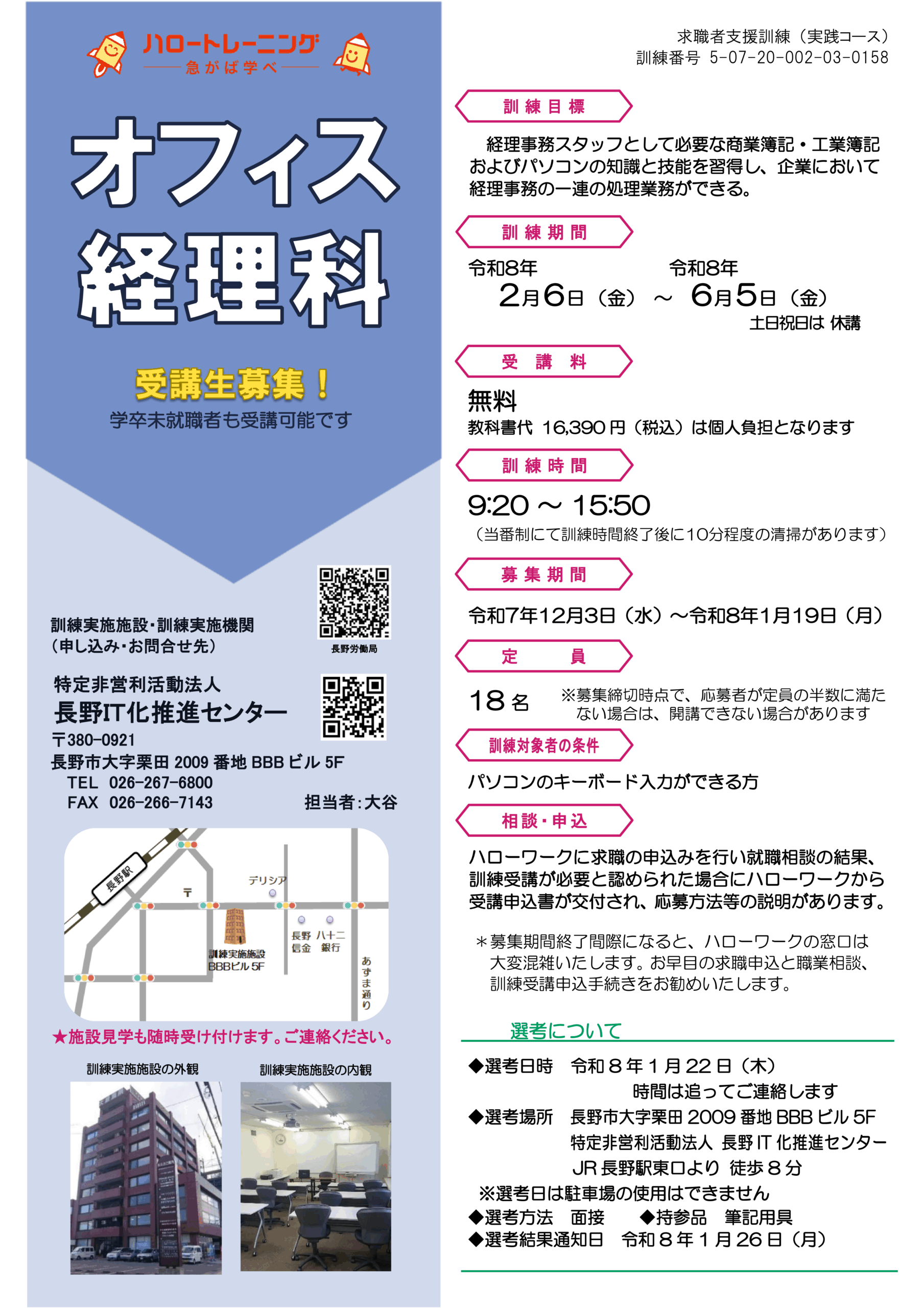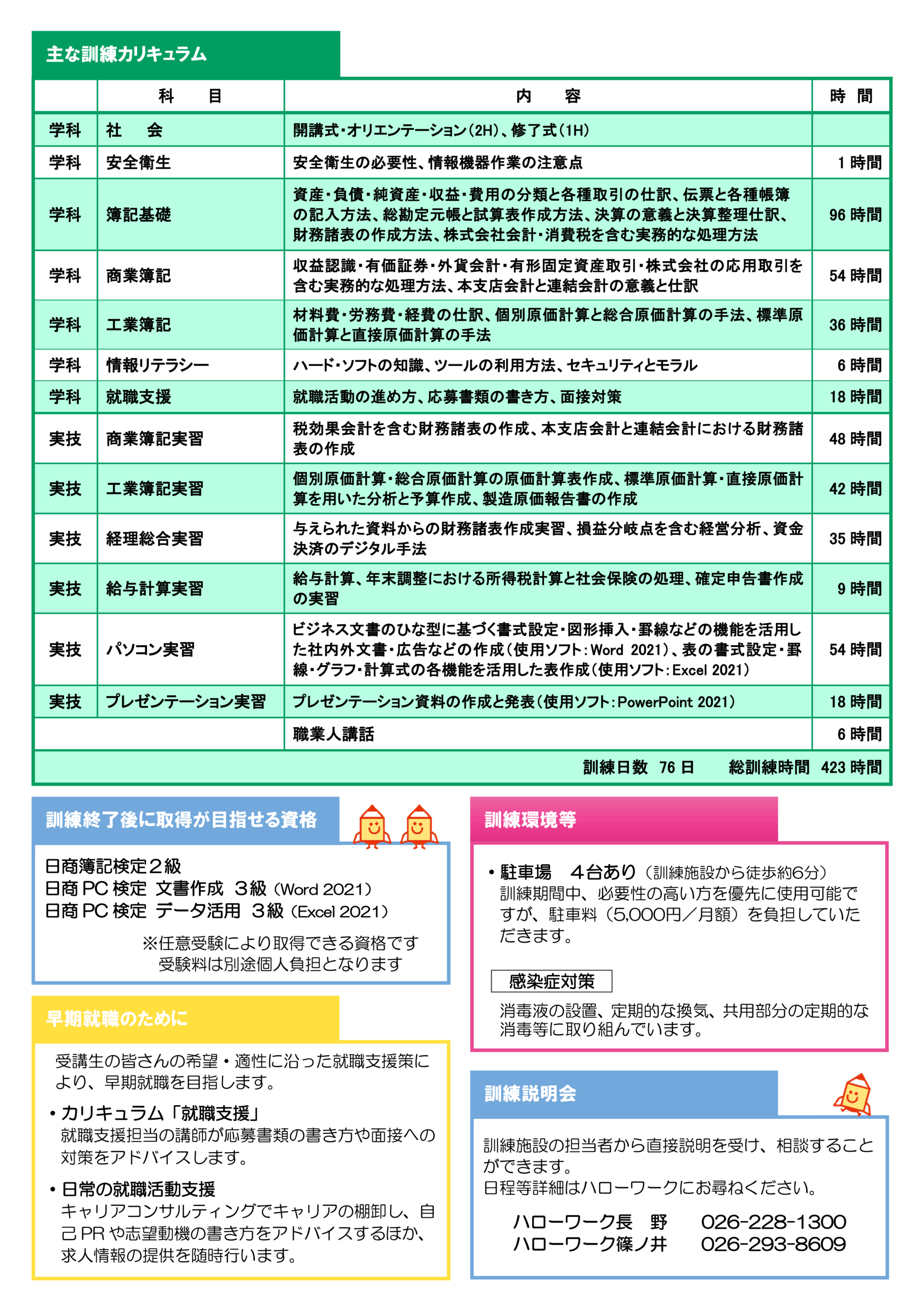 長野IT化推進センターでは、求職者や在職者に向けた職業訓練を行っております。主に、簿記やビジネスパソコンスキルなど、就職活動に活かせるような資格取得の手助けをする講座を実施しています。