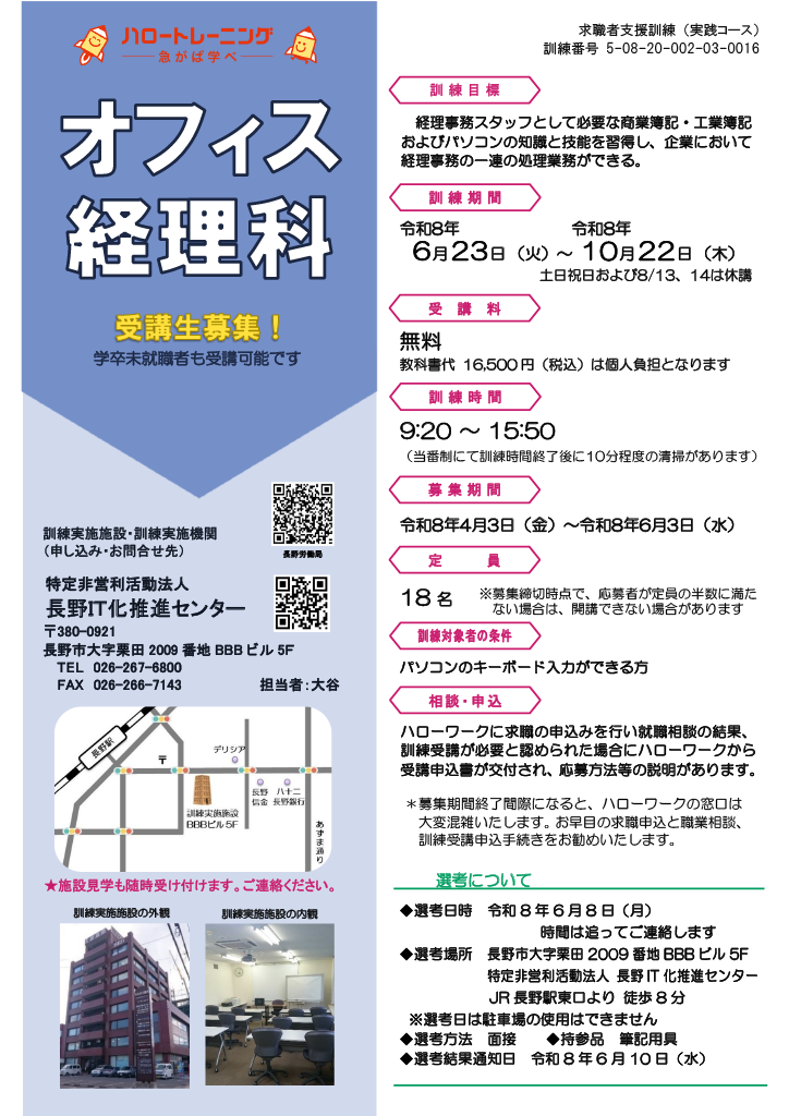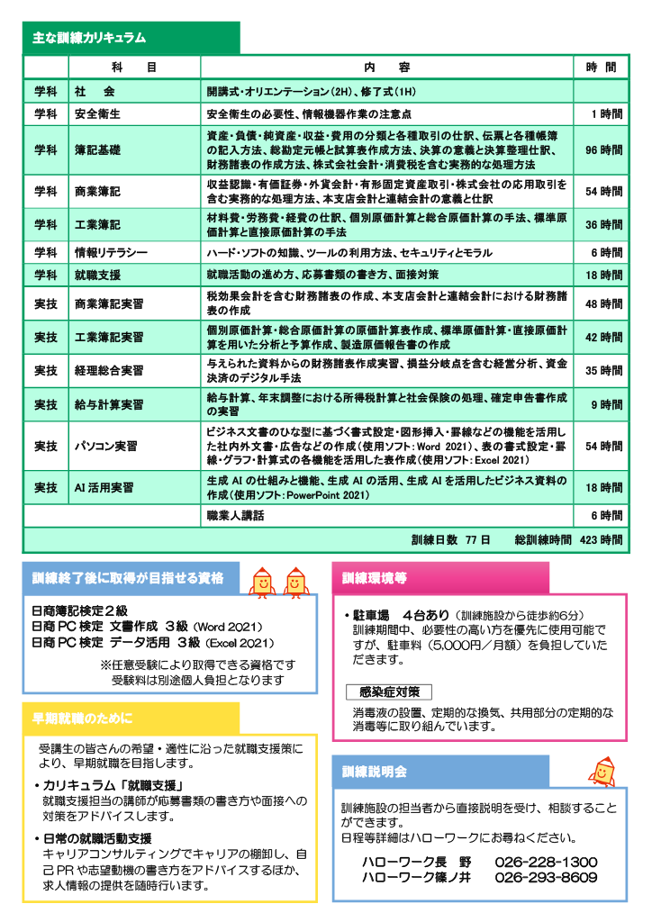 この訓練は、経理や事務系の再就職を目指す求職者の方々を対象とした職業訓練です。